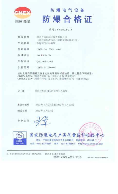 2012年5月4日,我公司向河南省國家防爆電氣產品質量監督檢驗中心提交了我公司自主研發的LQ型防爆系列產品的相關技術資料。經過檢驗中心的嚴格檢驗,專家組一致認為我公司產品技術先進,技術文件與防爆檢測中心的審查確認一致,操作指導文件完整;5月22日,我公司系列產品成功通過防爆測試,并獲得國家防爆電氣產品質量監督檢驗中心證書。